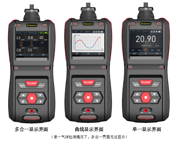 檢測方式:內置泵吸式測量,響應迅速,采樣距離超過10米,特殊氣路設計,可直接檢測負壓或正壓-0.5~2公斤的氣體,對測量結果無影響;可以同時檢測1~5種氣體。